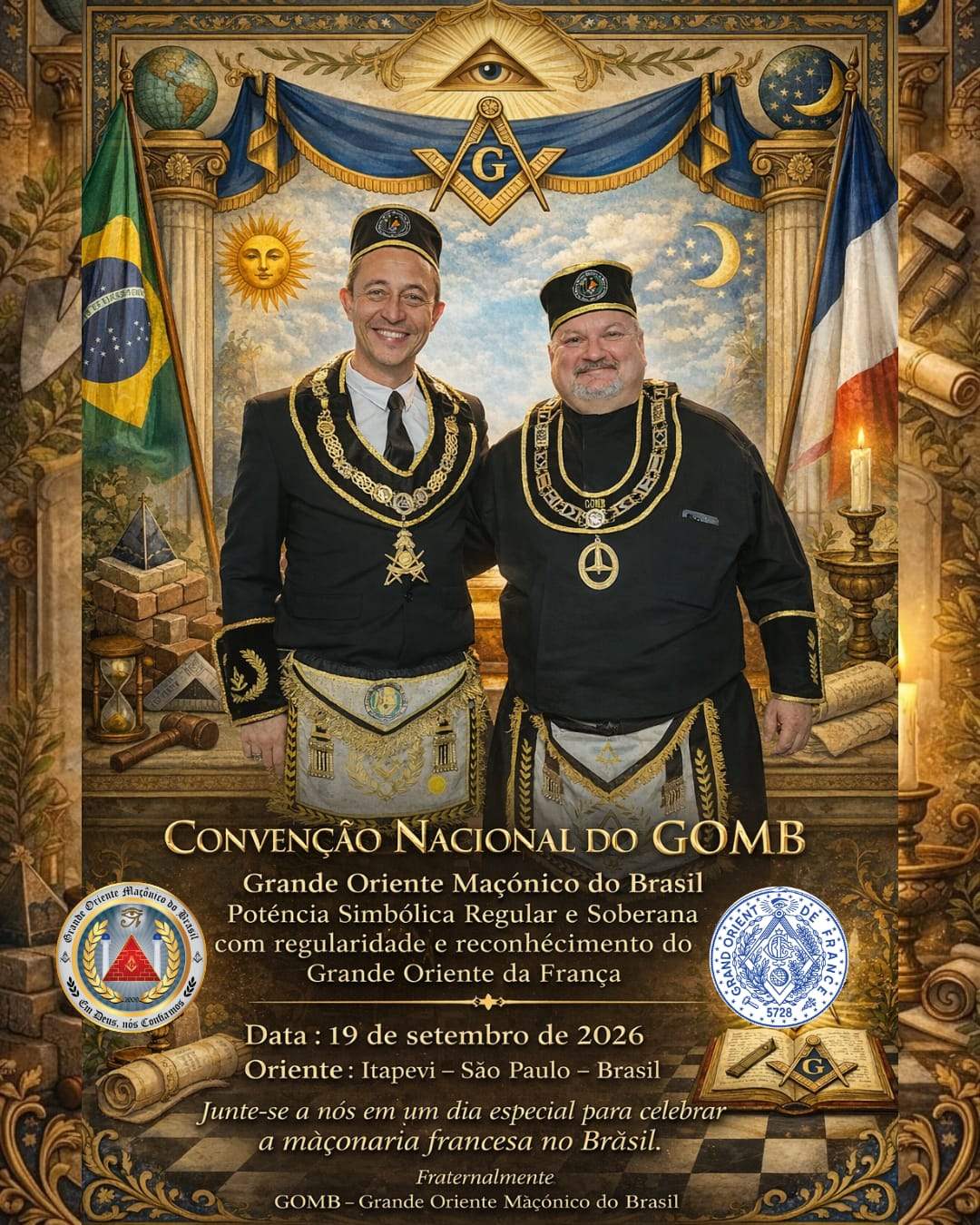 venha participar da Convenção Nacional do GOMB,que será realizada no oriente de Itapevi no estado de São Paulo,dia 19 de setembro de 2026, uma celebração a maçonaria da vertente francesa no brasil.