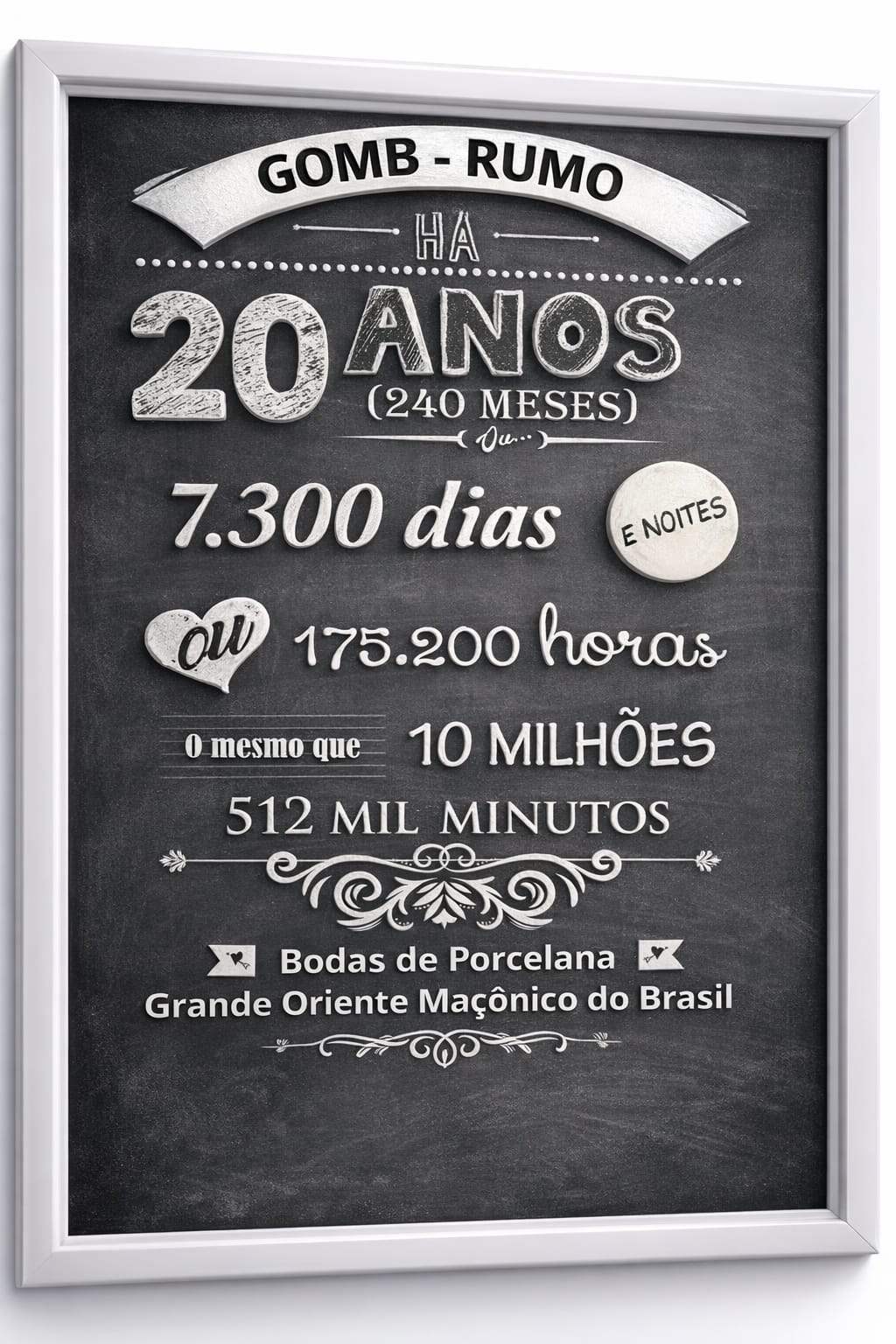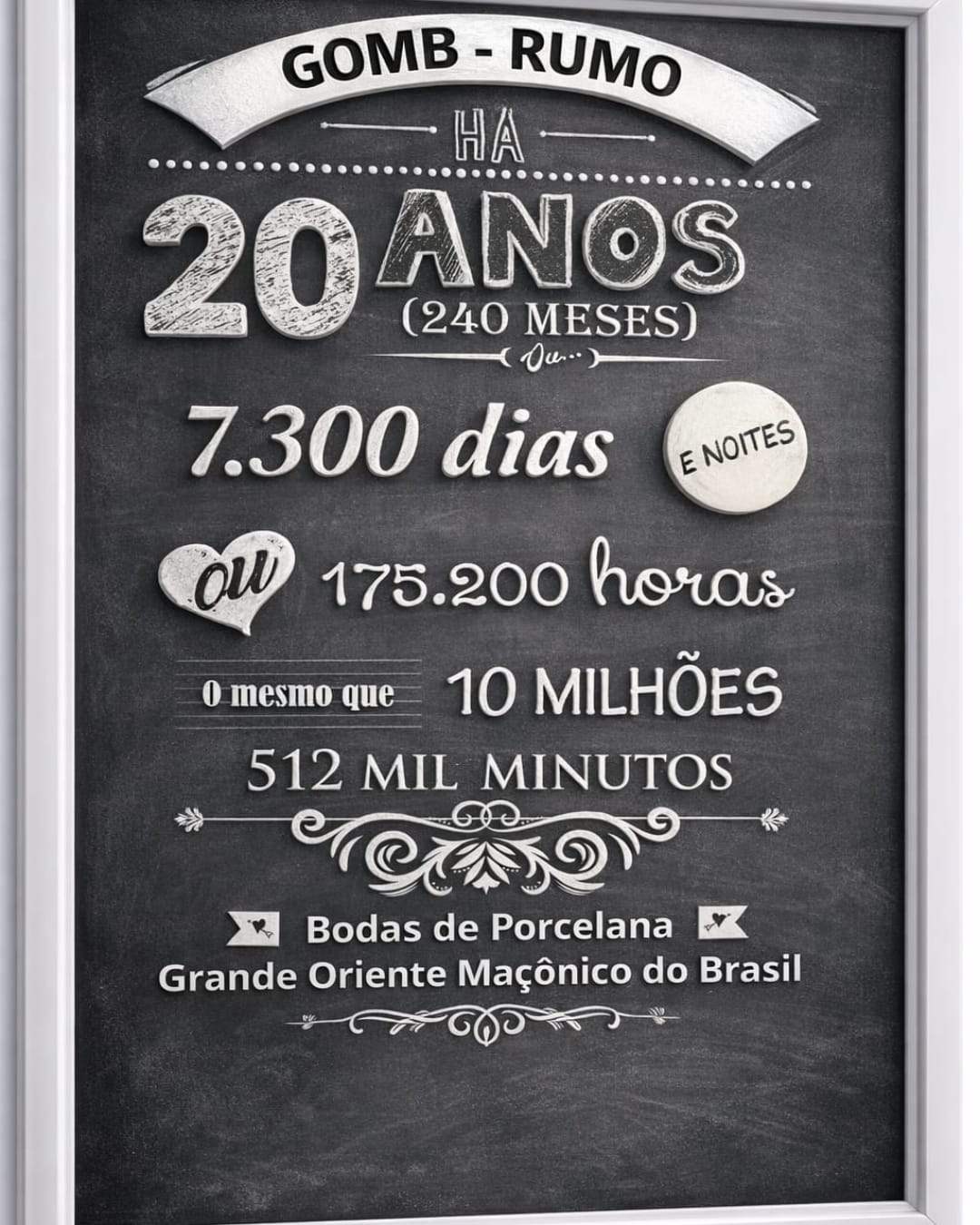 Rumo aos 20 anos em 2029 comemoramos nossos 20 anos de vida Maçônica, com muita alegria, satisfação e reunidos com nossos irmãos,fortalecendo nossa